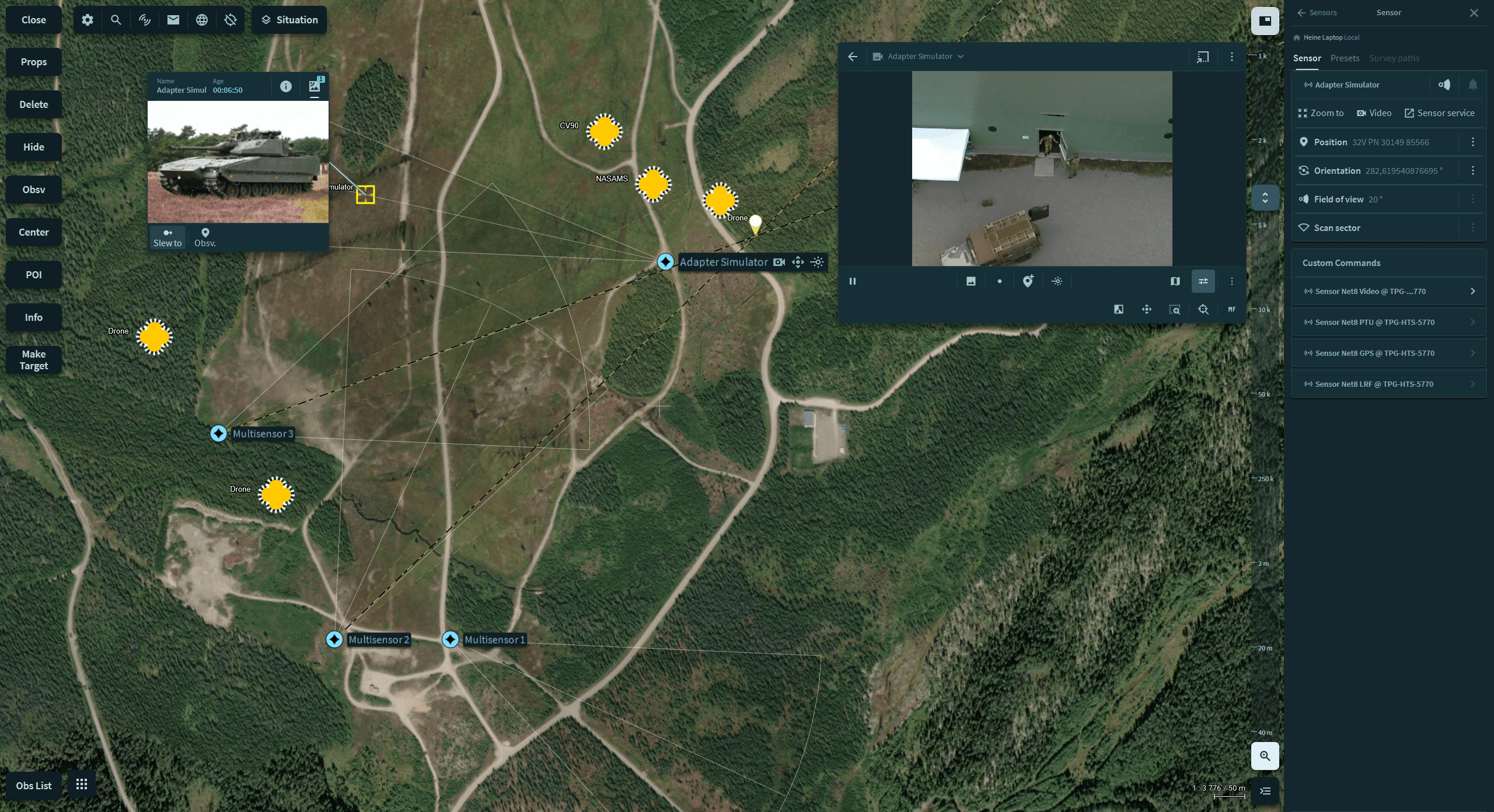Adapt video monitoring to your operational needs. Work with feeds in dedicated ISR panels, detach secondary views to place them alongside your map or other tools, or use video wall functionality to monitor multiple streams simultaneously. All views display georeferenced sensor positions and fields of view on the map, ensuring you always know exactly where each camera is looking.